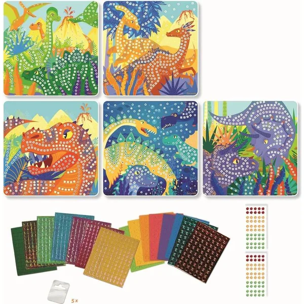 Activité créative de loisirs pour les enfants à partir de 5 ans. Les enfants décoreront 5 images impressionnantes de dinosaures à l’aide de pièces en mousse. Suivez les instructions et collez progressivement des formes de mosaïque colorées sur l’image, puis des pierres qui donneront de l’éclat à l’image. Une fois les images terminées, vous pouvez coller un crochet à l’arrière et accrocher l’œuvre finie au mur de la chambre d’enfant. La décoration en mosaïque est un plaisir qui développe la motricité fine, la concentration et la patience de votre enfant.