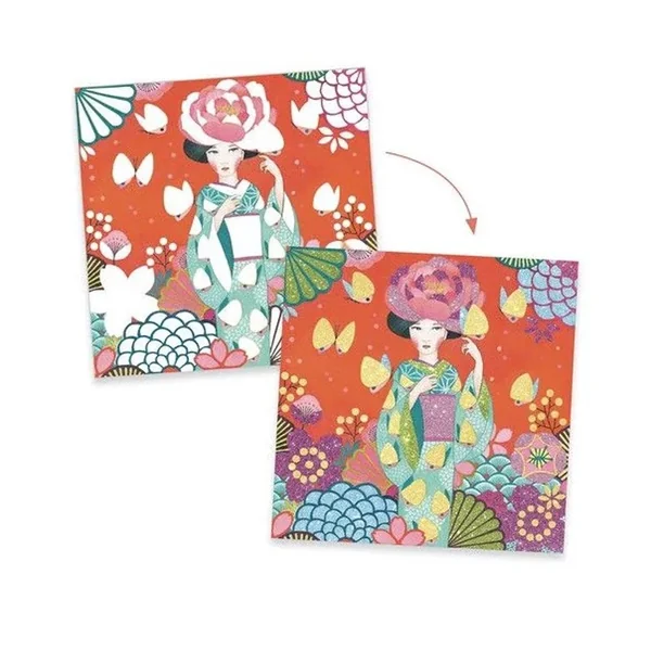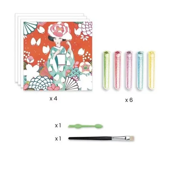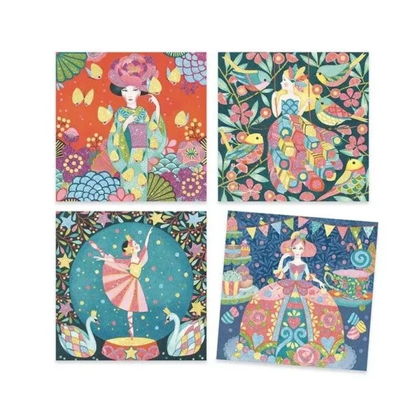 4 tableaux oniriques à illuminer de paillettes colorées. L’enfant place son tableau dans la boîte, il dévoile les zones préencollées grâce à l’outil fourni puis les saupoudre de poudre pailletée en suivant le code couleurs indiqué dans le livret. Une fois l’activité terminée, les jeunes filles scintillent et prennent vie dans leurs décors féériques.