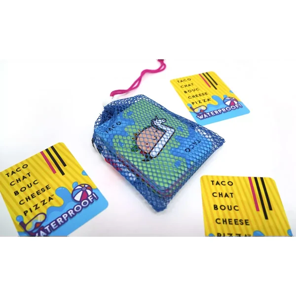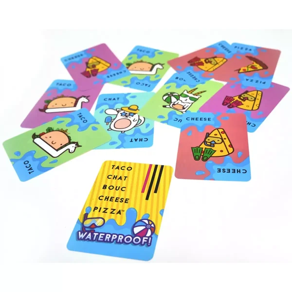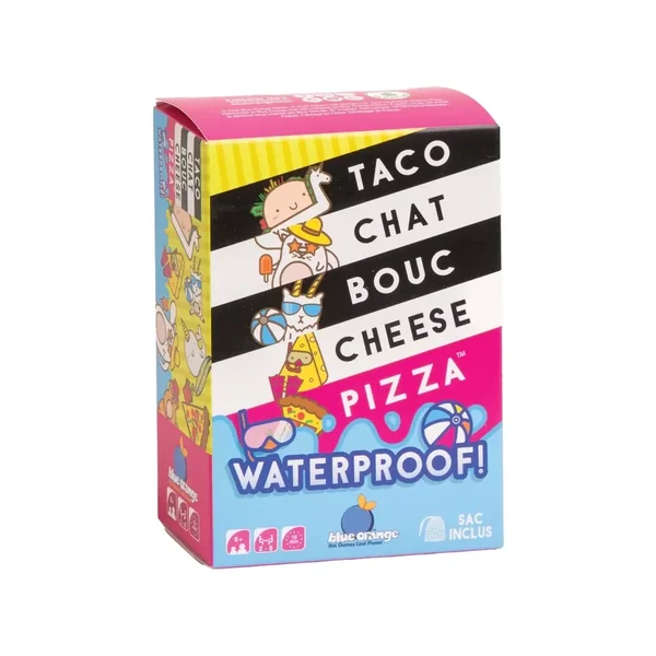 Taco Chat Bouc Cheese Pizza Waterproof est un jeu d’ambiance jouable de 2 à 8 joueurs, dès 8 ans pour des parties d’environ 30 minutes, édité par Blue Orange.