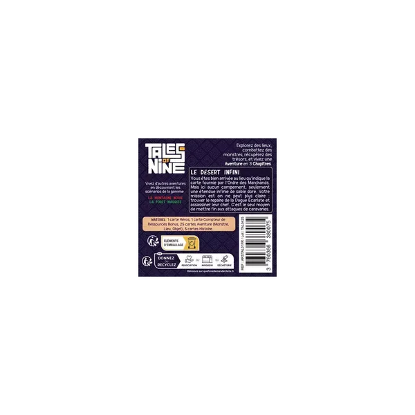 Chaque boîte de Tales of Nine contient 3 chapitres d’une histoire à découvrir sous forme de cartes. Huit d’entre elles sont placées autour de la carte Héros, formant la région ou le donjon à explorer.