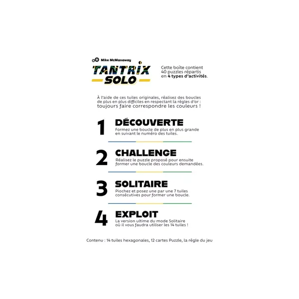 Tantrix Solo est un jeu de société de logique jouable en solo, dès 8 ans pour des parties d’environ 20 minutes, édité par Gigamic. Tantrix Solo contient : 14 tuiles, 12 cartes 60×82 mm, la règle du jeu.