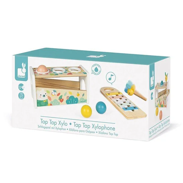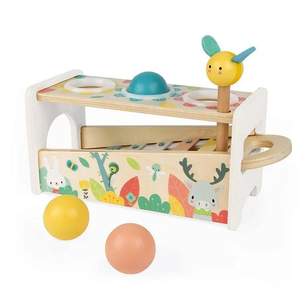 un marteau abeille pour frapper les 3 balles qui tombent en faisant tinter les touches du xylophone et un xylophone amovible pour pouvoir jouer partout !