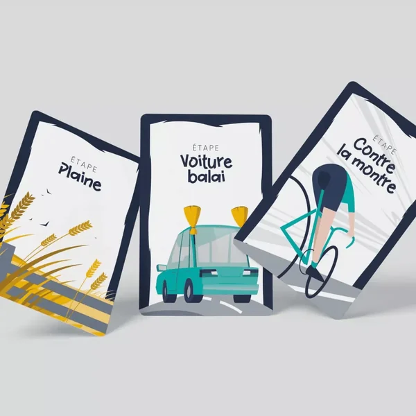 Tape l’Etape est un jeu de réflexion. En effet, choisissez méticuleusement vos étapes parmi les profils variés comme Plaine, Descente, Montagne, Contre la montre, et Voiture Balai. La stratégie est cruciale, chaque carte jouée influençant le classement final.