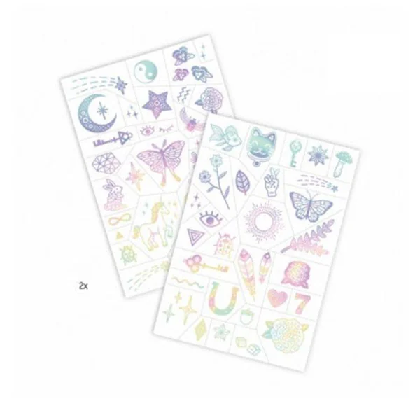 Les Tatoos Lucky charms de Djeco pour les enfants à partir de 3 ans possèdent 2 planches de tatouages temporaires et changent de couleur en fonction de l’angle de vue, avec des papillons, des poissons, des plantes…