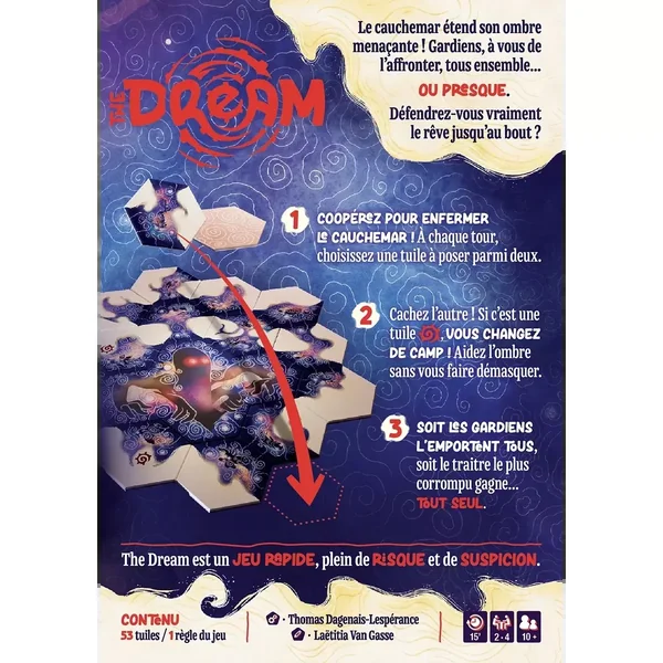 The Dream est un jeu rapide, plein de risque et de suspicion. Le cauchemar étend son ombre menaçante ! Gardiens, à vous de l’affronter, tous ensemble… ou presque. Défendrez-vous vraiment le rêve jusqu’au bout ?
