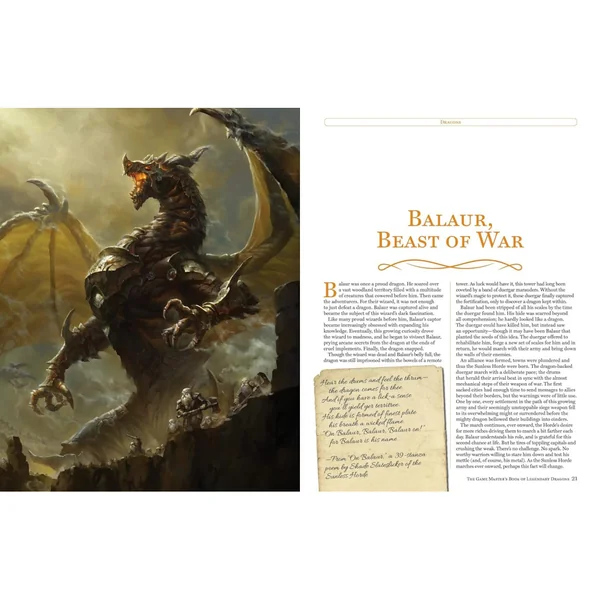 Les MJ y trouveront également de nouvelles créatures apparentées aux dragons, des drakes, des kobolds et des races de dragons, ainsi que de nouvelles organisations liées aux dragons, compétences, classes et magies, incluant des cavaliers de dragons, des chasseurs de dragons, des sorts améliorés, des combats aériens et des options de dirigeables, des cultes de dragons, des objets magiques, et plus encore.