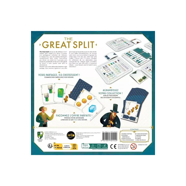 Dans The Great Split, votre objectif est d’avoir la plus prestigieuse collection de richesses. À chaque tour, séparez votre main de cartes en 2 groupes, mettez les dans le portefeuille de votre couleur en respectant cette séparation, puis passez-les au joueur à votre gauche. Vous recevrez donc le portefeuille du joueur à votre droite.