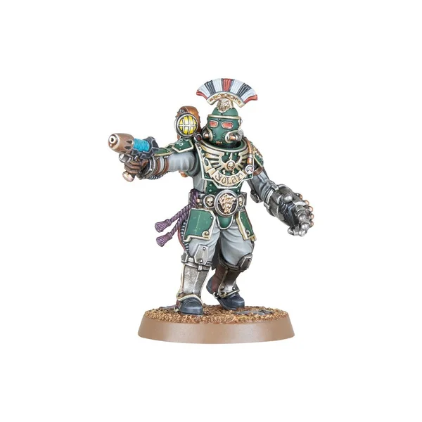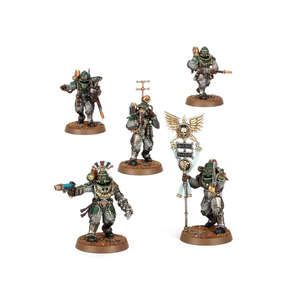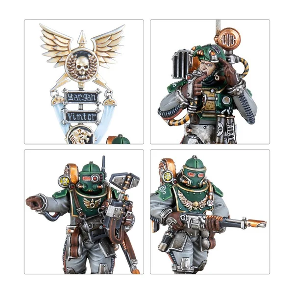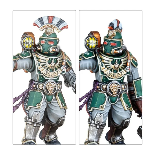 Cet kit très polyvalent permet autrement d’assembler une Section d’État-major de Ligne de rang moindre, portant des armures moins décorées et un vexillum plus modeste. Ce kit peut sinon être assemblé comme un Maréchal Légat accompagné de quatre Protecteurs. Vous trouverez encore plus d’armes pour le Maréchal Légat: une serpentine volkite, un pistolet Inferno ou un pistolet archéotech, et un marteau Thunder ou une lame de Parangon. Les Protecteurs peuvent recevoir l’équipement en surplus de leur seigneur!