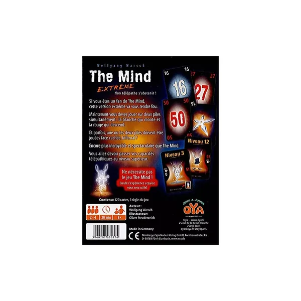 The Mind Extreme est un jeu de Wolfgang Warsch, il est édité par Oya. Suite du jeu The Mind, il est accessible dès l’âge de 8 ans pour des parties de 20 minutes. La mécanique principale du jeu est la déduction et la coopération.