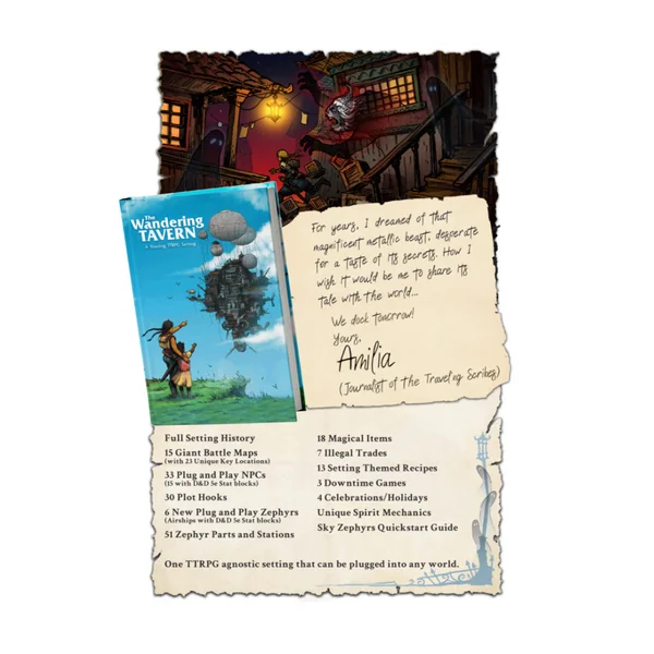 Il s’agit d’un univers de JdR flottant, agnostique en termes de système, avec en option des statistiques compatibles D&D 5e. Le livre regorge d’accroches de scénarios, de mystères, de menaces et de tout ce dont vous avez besoin pour bâtir une campagne complète. Mais si vous avez déjà un monde ou un univers établi, The Wandering Tavern constitue l’escale idéale pour vos joueurs : l’endroit parfait pour souffler un peu et s’embarquer dans une nouvelle forme d’aventure.