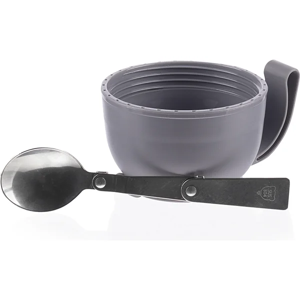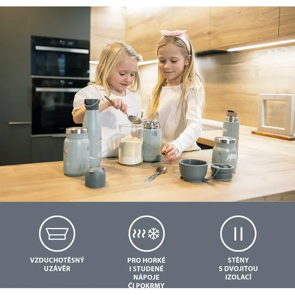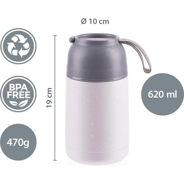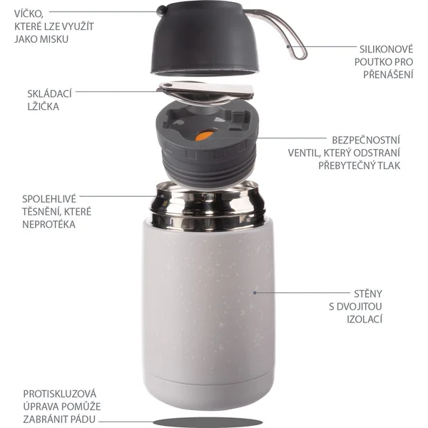 Elle comprend une cuillère pliante astucieuse qui s’intègre parfaitement dans le couvercle, permettant à votre enfant de déguster une bouillie ou une soupe chaude n’importe où. Le couvercle de la bouteille peut être utilisé comme tasse ou bol. Le couvercle supérieur est équipé d’une soupape de sécurité qui libère l’air excédentaire créant une pression. Grâce à la libération de l’air comprimé, le récipient peut être facilement ouvert et cela évite de se brûler avec la vapeur.