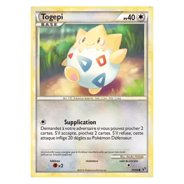 Découvrez Togepi (ud070), une carte Pokémon de l’extension Indomptable, provenant du bloc HeartGold & SoulSilver. Idéale pour compléter votre collection, cette carte Commune plaira autant aux collectionneurs qu’aux joueurs.