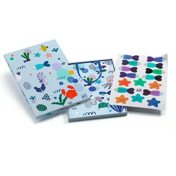 Une grande toise murale Vie Aquatique Djeco avec de nombreux stickers repositionnables sur le thème de la mer.