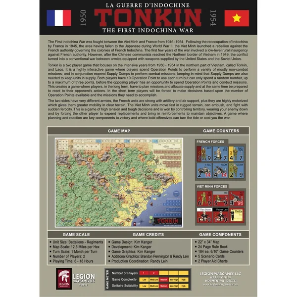 TONKIN est un jeu couvrant la guerre d’Indochine entre la France et le Viet Minh. La guerre se déroula de 1946 à 1954. Le jeu commence en 1950 date à laquelle les communistes s’emparent du pouvoir en Chine et commencent à aider le Viet Minh. La carte représente le Vietnam du nord (Tonkin) et le Laos où eurent lieu les principaux combats. Un des joueurs joue le Viet Minh et les forces laotiennes du Pathet Lao. Le second joueur joue la France avec ses troupes coloniales.