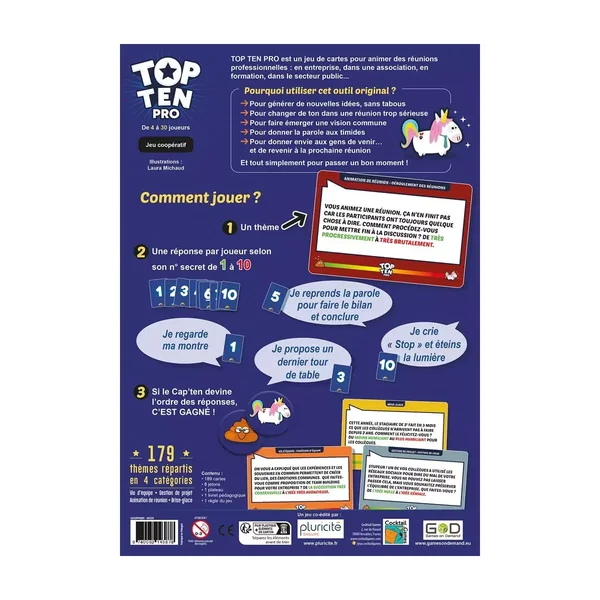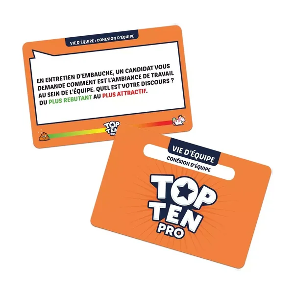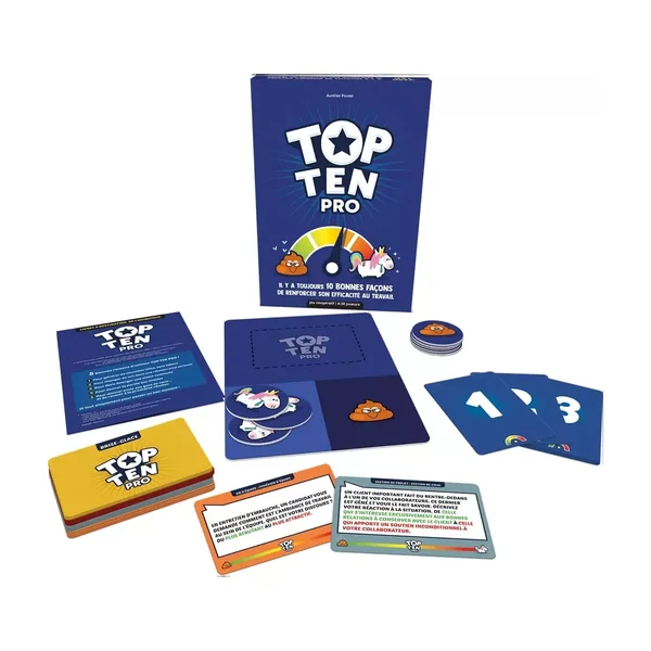 Top Ten Pro est un jeu de société d’ambiance pédagogique jouable de 4 à 30 joueurs, dès 16 ans pour des parties de 30 minutes, co-édité par Pluricité, Games on Demand et Cocktail Games. Toujours 10 bonnes raisons d’améliorer son efficacité au travail ! Rendez les réunions ludiques et uniques avec ce jeu pédagogique idéal pour tout animateur de réunions et de séminaires ! Chaque participant répond à un thème (adapté au cadre professionnel, original et fun) en fonction de son numéro (entre 1 et 10). Ensuite, l’équipe cherche à remettre toutes les réponses dans le bon ordre pour gagner ! Une bonne méthode pour faire émerger des idées, une vision commune et bien communiquer. Top Ten Pro est une version du jeu Top Ten pour les personnes qui doivent animer des réunions, de manière ludique pour exprimer tous les points de vue dans la bonne humeur. Ce jeu reprend la mécanique qui a fait le succès de Top Ten, avec des contenus adaptés au contexte professionnel : une version avec 189 cartes grand format, 8 jetons, 1 plateau central et 1 livret pédagogique. Un jeu coopératif innovant qui bouleversera vos réunions !