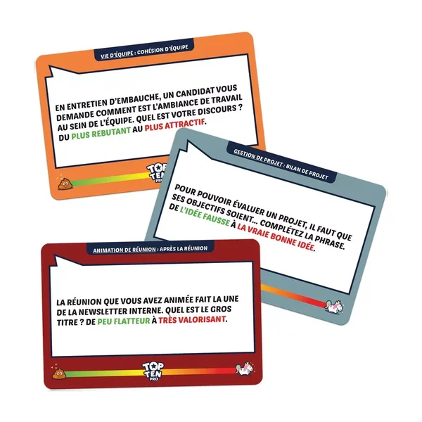 Avec 179 « Thèmes » répartis en 4 catégories différentes (Animation de réunion, Gestion de projet, Qualité de vie au travail, et Vie d’équipe), Top Ten Pro permet de : – Libérer la parole en toute sécurité car c’est un outil extraordinaire pour aborder les sujets qui fâchent, sans se fâcher. Grâce aux numéros qui obligent les participants à adopter une posture qui n’est pas la leur, chacun peut s’exprimer en dehors de son rôle habituel, en toute liberté. – Révéler les préférences car au moment de mettre les cartes dans l’ordre, le jeu agit comme un puissant révélateur de préférences. Qu’est-ce qui est le plus important pour le projet ? Aller vite ou bien faire les choses ? Choisir un ordre ? C’est aussi mettre à nu les priorités une par une. Grâce à TOP TEN PRO, les participants pourront voir les priorités puis les ordonner collectivement. – Mais également de passer un bon moment et parfois, c’est l’essentiel ! Avec ce jeu et le bon choix de questions, c’est l’assurance de soulever quelques zygomatiques, sortir chacun de son rôle professionnel et partager un bon moment.