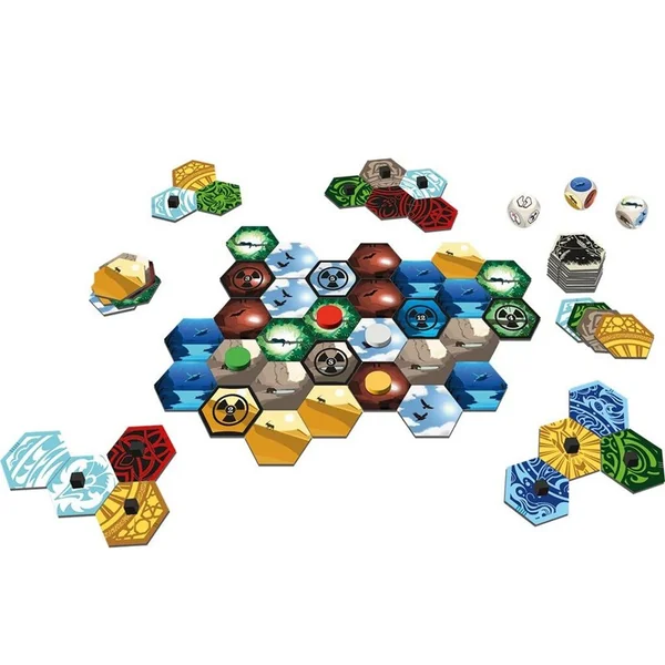 Des tuiles représentant des terrains (6 différents) sont placées aléatoirement (mais en respectant certaines règles) et devront être remises dans la disposition choisie en début de partie. Pour cela, chaque joueur dispose de pions permettant de se déplacer ou de faire l’action de son animal totem (il y en a 6 différents pour autant de pouvoirs). Il faut aussi compter sur le dé catastrophe qui peut amener à polluer des terrains qu’il faut décontaminer. Pas de tour de jeu ici, tout le monde joue en même temps, dans un sympathique chaos. Dans la version de base, on joue sans chronomètre, dans la version classique par contre, vous êtes limités à 8 minutes !