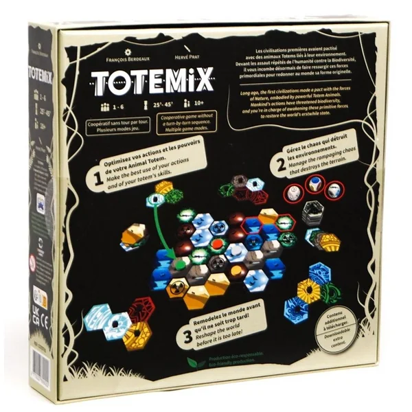 Dans Totemix, vous devrez coordonner vos actions respectives en temps réel et mixer vos Totems afin de reconstituer la configuration choisie en début de partie. Coopération, placements de tuiles, temps réel et puzzle dynamique sont les maîtres mots de ce jeu qui peut aussi se jouer contre la montre !