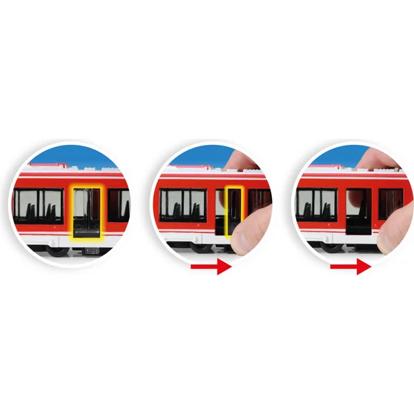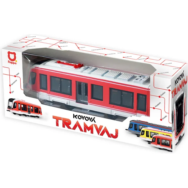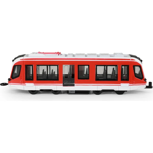 Tramway en métal original de couleur rouge. Les portes peuvent être ouvertes et fermées manuellement à l’aide d’un levier situé sous les portes du véhicule.
