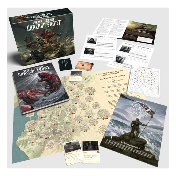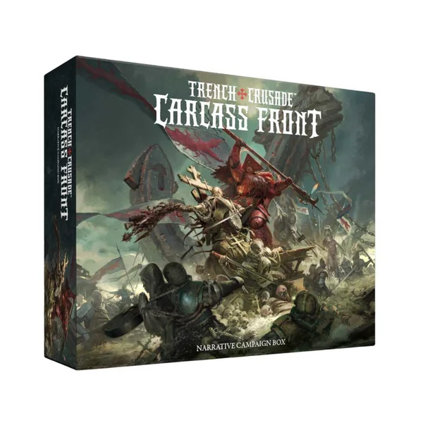 Les armées infernales, toujours en mouvement, s’agitent une fois de plus dans les terres dévastées au nord de New Antioch, connues sous le nom de Front des Charognes. Partout, des présages laissent entendre que le retour de Léviathan est proche. Des bandes de Fidèles et de Déchus se rassemblent pour accomplir la Prophétie de Léviathan, dans l’espoir du salut de l’humanité… ou pour sceller sa damnation. Carcass Front est un coffret indispensable pour le jeu de figurines Trench Crusade, qui comprend des figurines pour deux bandes rivales, des scénarios, deux campagnes et des accessoires utiles pour vos parties. Dans la boîte, vous trouverez : Le livret de campagne Carcass Front Il contient 96 pages de règles nouvelles et étendues, d’univers et d’illustrations couvrant la région déchirée du Carcass Front et ses lieux clés, ainsi que les principaux acteurs du conflit qui façonneront le prochain chapitre de la saga Trench Crusade. Il comprend des règles étendues pour la Procession l’Affliction Sacrée et les Corsaires Hérétiques en tant que bandes à part entière, ainsi que les détails de deux campagnes complètes. La première est une campagne narrative pour 2 joueurs qui propose une série de scénarios sur mesure et liés entre eux, sur le thème de l’invocation (et, en option, de la mise à mort) de Léviathan. La seconde est une campagne sur carte pour 2 à 8 joueurs où les bandes s’affronteront pour les ressources et les secrets ésotériques du Carcass Front, et qui propose diverses nouvelles mécaniques pour garantir qu’aucune campagne ne se ressemblera jamais. Deux bandes de guerre complètes : la Procession de l’Affliction Sacrée et les Corsaires Hérétiques