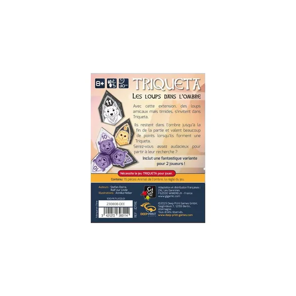 Les Loups dans l’Ombre est une extension, pour Triqueta, le jeu de collection, dès 8 ans, de 2 à 5 joueurs, pour des parties de 30 minutes, édité par Gigamic. Cette extension, inclut une fantastique variante pour 2 joueurs. Triqueta est un jeu de collection malin dans lequel la tension monte au fur et à mesure de la partie !