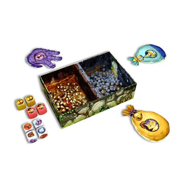 Contenu du jeu : 60 Diamants, 50 Pépites d’Or, 5 Sacs Aventuriers, 1 Main du Troll, 8 Dés et 1 règle du jeu.