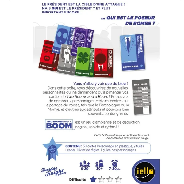 Le Président est la cible d’une attaque ! Mais qui est le Président ? Et plus important encore… Qui est le poseur de bombe ? Dans ce jeu explosif, vous êtes répartis dans deux pièces séparées. Retrouvez vos coéquipiers, bluffez, négociez, et désignez les otages qui changeront de pièce. Lors du décompte final, si le Président est dans la même pièce que le Poseur de bombe, ça fait BOUM !
