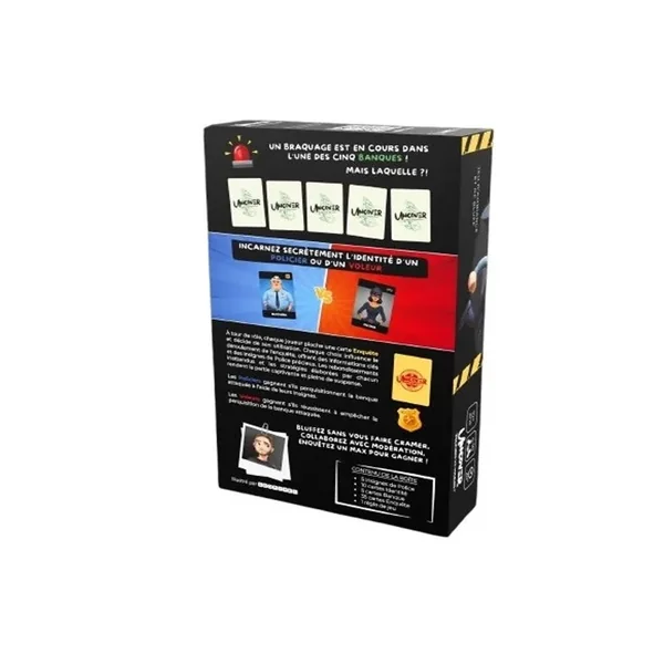 À tour de rôle, piochez une carte Enquête et décidez de son utilisation. Pour gagner, vous devez localiser la banque attaquée, récupérer des insignes de police et enquêter sur l’identité des autres joueurs.
