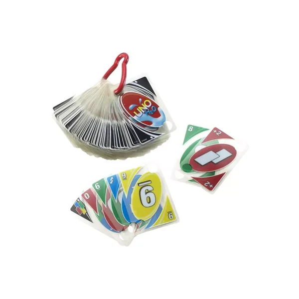 Le jeu Uno H2O comprend également un mousqueton qui permet d’accrocher les cartes et s’attache facilement à un sac de plage, un sac à dos ou à un équipement de camping.