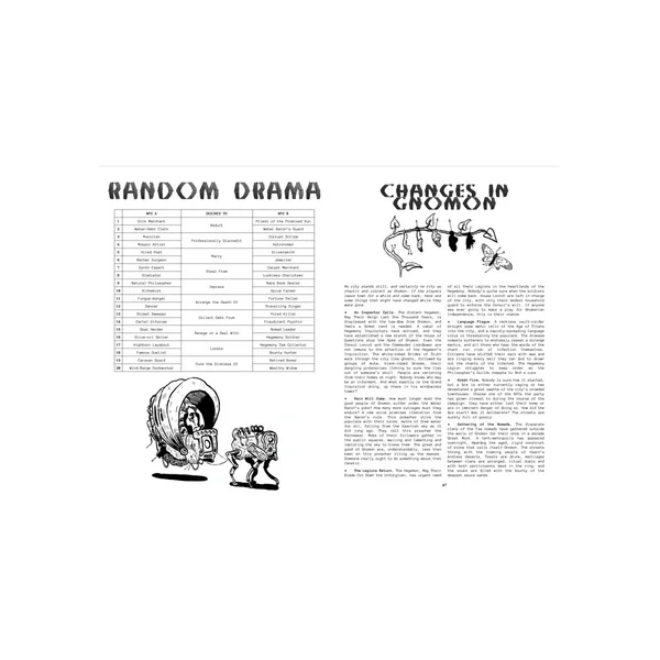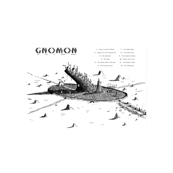 Le deuxième numéro (48 pages) est un supplément d’aventure urbain qui explore plus en profondeur le monde lointain décrit dans le premier volume. Il vous invite à découvrir Gnomon, une cité marchande décadente et périlleuse.