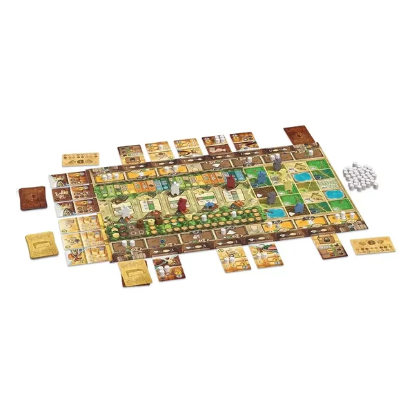 La partie se déroule sur deux années, rythmées par les saisons. Au printemps et en automne, vous envoyez vos ouvriers récolter des ingrédients sur un plateau commun composé de parcelles. Chaque ouvrier est lié à celui de votre adversaire par sa couleur : choisir un travailleur impose le choix du même à l’autre joueur au tour suivant. Selon le type de carte Logement activée (Travail d’équipe ou Labeur solitaire), vous optimisez différemment la production de raisins, lait, sel, sucre, levure ou ferments.