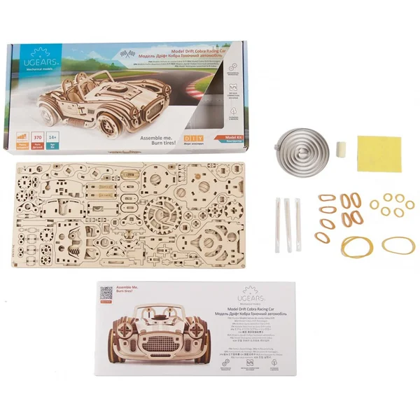 Nous savons que vous êtes fans de modélisme automobile et que vous adorez les modèles Cabriolet, Roadster et Bolide U-9 ! Bonne nouvelle : vous allez devoir faire un peu de place sur votre étagère, car un nouveau modèle mécanique très performant vient de faire son entrée dans la collection Ugears. Nous vous présentons la Voiture de course Drift Cobra, un cabriolet deux places aux lignes élégantes, inspiré de la voiture de sport la plus célèbre de tous les temps : la Shelby Cobra 427. La Cobra 427, produite entre 1965 et 1967, était équipée d’un moteur de 7 litres développant 450 à 510 chevaux. Elle atteignait le 0 à 100 km/h en un peu plus de 4 secondes et sa vitesse maximale était de 260 km/h.