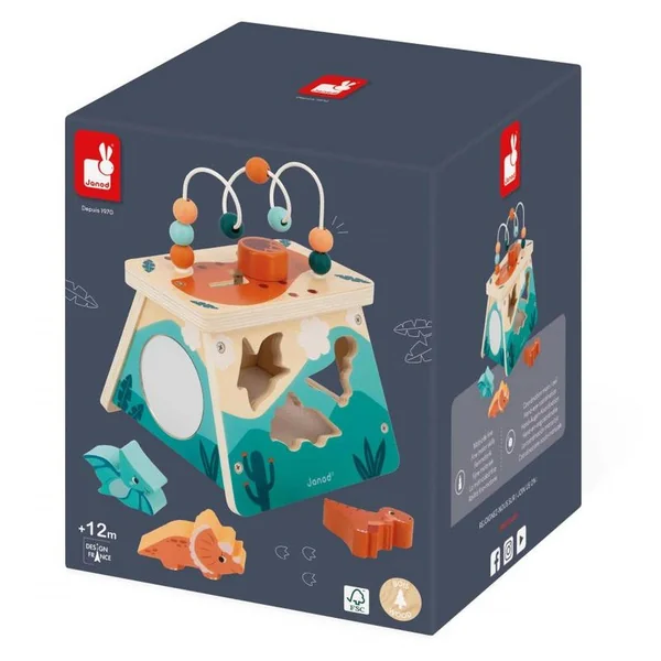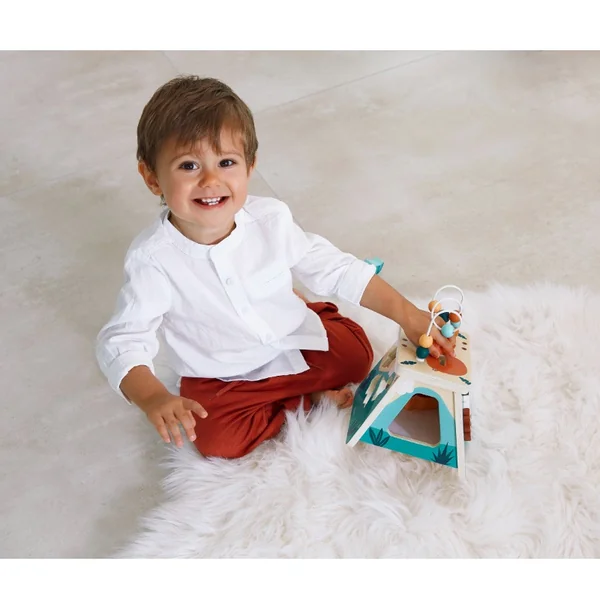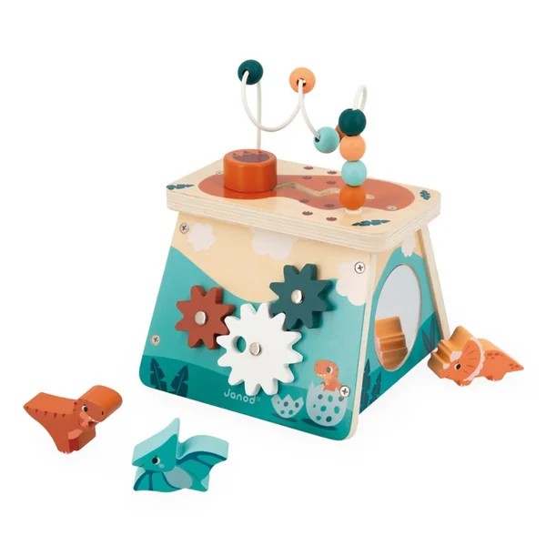 Faites découvrir tout en douceur le monde des dinosaures à votre enfant à travers ce volcan multi-activités. Sur la face de devant vous retrouverez une boite à forme avec un tyrannosaure, un tricératops et un ptéranodon à encastrer dans la forme correspondante. Votre enfant pourra facilement récupérer les pièces grâce à une grande ouverture sur le côté. La face de derrière propose trois engrenages à tourner, sur le côté gauche un miroir et pour finir sur le haut de ce volcan multi-activités se trouvent un labyrinthe et un boulier et ses perles en bois.