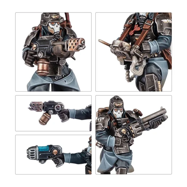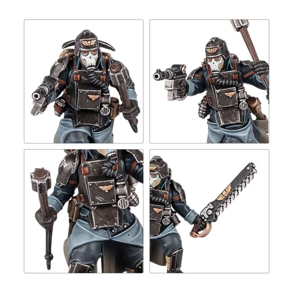 Ce kit contient de nombreuses options pour personnaliser l’apparence de vos figurines et s’assurer qu’elles disposent des bons outils pour les missions que vous leur assignerez. Chaque Sapeur peut être assemblé avec un fusil de combat, ou un pistolet-mitrailleur et une matraque de tranchée. L’un d’entre eux peut être assemblé avec un lance-flammes, et un autre peut être équipé d’un contrôleur de mine télécommandée. Enfin, l’un d’entre eux peut être assemblé en tant que Maître du Guet et armé d’un pistolet bolter, d’un pistolet-mitrailleur, d’un pistolet à plasma, d’un lance-flammes léger ou d’un fusil de combat, et d’une épée tronçonneuse, d’une arme énergétique, d’une matraque de tranchée ou d’une grenade.