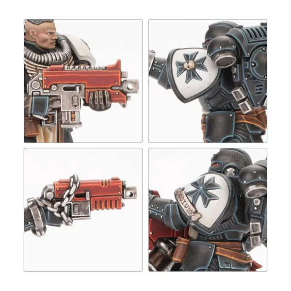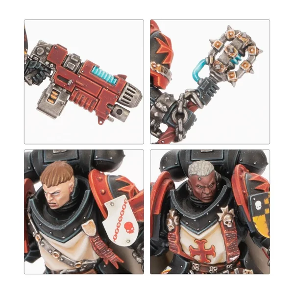 L’Escouade Crusader comprend quatre Novices équipés au choix d’armes à feu de Novices ou de pistolets bolters et d’épées tronçonneuses. Les six Initiés peuvent être armés d’un fusil bolter, ou d’un pistolet bolter lourd et d’une épée tronçonneuse. Deux Initiés peuvent être armés d’un pyro-éclateur, et deux d’un pistolet bolter lourd et d’un gantelet énergétique. Un des Initiés peut être assemblé comme un Frère d’Épée optionnel, doté d’une arme énergétique de maître et d’un pistolet bolter lourd ou d’un pyropistolet. Les têtes et les épaulières sont interchangeables entre les Initiés, et ils disposent aussi de sceaux de pureté, d’écussons et de reliques optionnels.