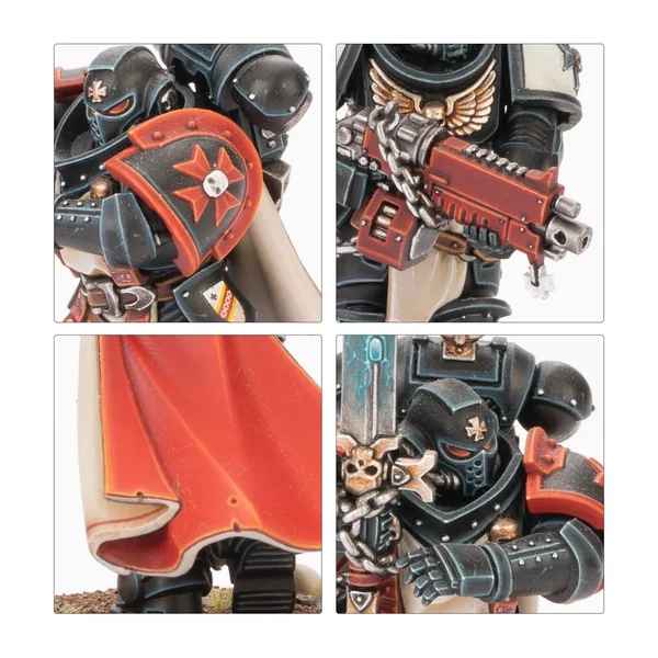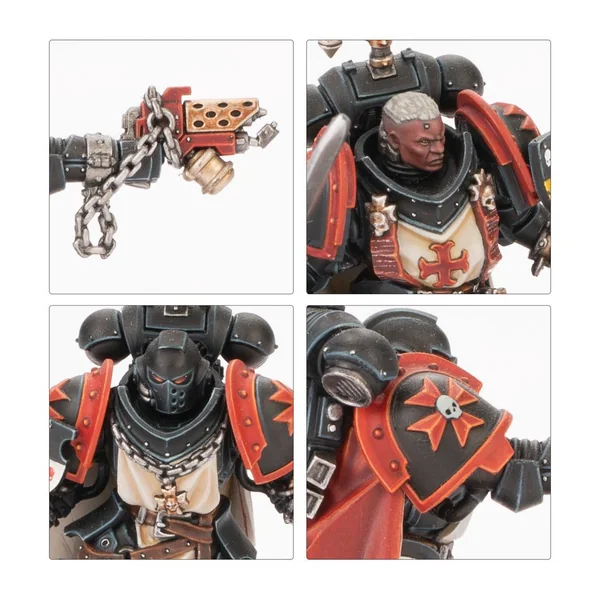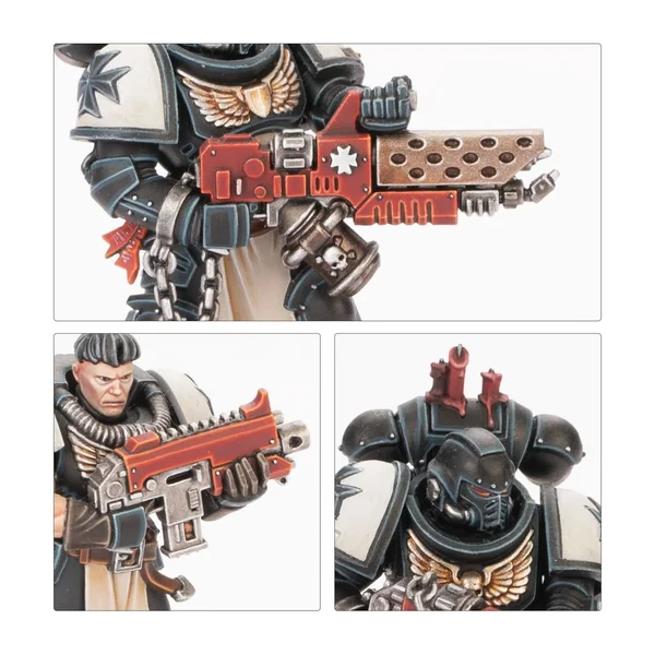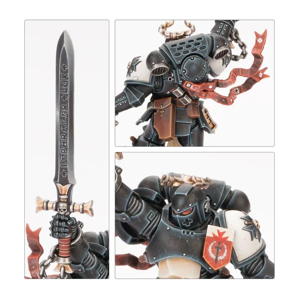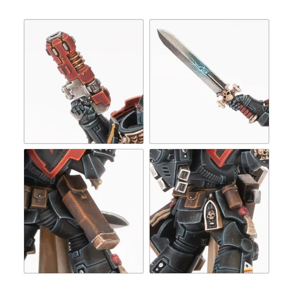 Les Frères d’Épée sont chacun armés d’un pistolet bolter lourd, et au choix, d’une épée tronçonneuse ou d’une arme énergétique de maître. Un membre de l’escouade peut être armé d’un marteau Thunder, un d’un pistolet à plasma, deux de pyropistolets et un de griffes Lightning jumelées. Vous pouvez aussi assembler un Castellan optionnel armé d’un pistolet bolter lourd ou d’une arme combinée, et d’une épée tronçonneuse ou d’une arme énergétique de maître. Les paquetages dorsaux et les icônes qui les surmontent, les épaulières, écussons et têtes sont tous interchangeables entre les figurines.