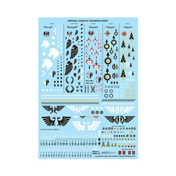 La Planche de Décalcos des Chevaliers Impériaux propose 583 décalcos de grande qualité. La Planche de Décalcos d’Armigères des Chevaliers Impériaux propose 277 décalcos de grande qualité. Ces planches proposent des décalcos des Maisonnées de Chevaliers Terryn, Hawkshroud, Cadmus, Taranis et Raven, ainsi que plusieurs marquages divers, comme des symboles d’identification, des honneurs de bataille et des poinçons de fabricant. Ces figurines sont fournies non peintes et nécessitent assemblage.