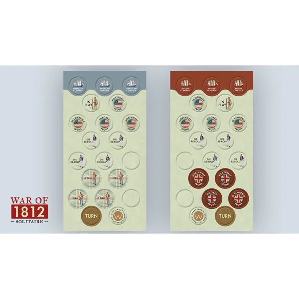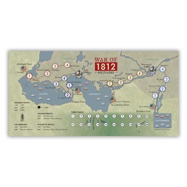 War of 1812 Solitaire vous place aux commandes des forces américaines qui tentent d’envahir et d’occuper le Canada. L’IA britannique défend l’empire. Les deux camps ont des armées sur les fronts en jeu, des navires sur les Grands Lacs et doivent faire face aux guerriers amérindiens et à leur influence dans le Nord-Ouest.