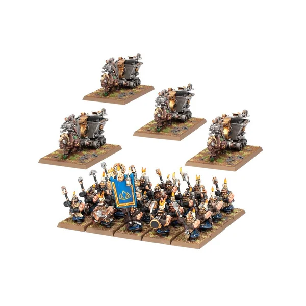 Ce kit en plastique permet d’assembler 20 Mineurs Nains et quatre Chariots de Mineur, des tunneliers combattants pour les armées des Forteresses Naines. Chacun de ces vaillants excavateurs est vêtu d’une lourde cotte de mailles et porte une pioche pour ouvrir même les armures ennemies les plus solides. Ce kit fournit également toutes les améliorations d’état-major dont vous aurez besoin, que vous préfériez déployer vos Mineurs Nains en petits groupes ou en une seule grosse unité: vous pourrez assembler des musiciens, des champions pouvant optionnellement être armés d’une foreuse à vapeur, et des porte-étendard avec plusieurs icônes de bannière au choix. Les Chariots de Mineur sont tirés par de robustes poneys qui peuvent être équipés de leurs propres foreuses.