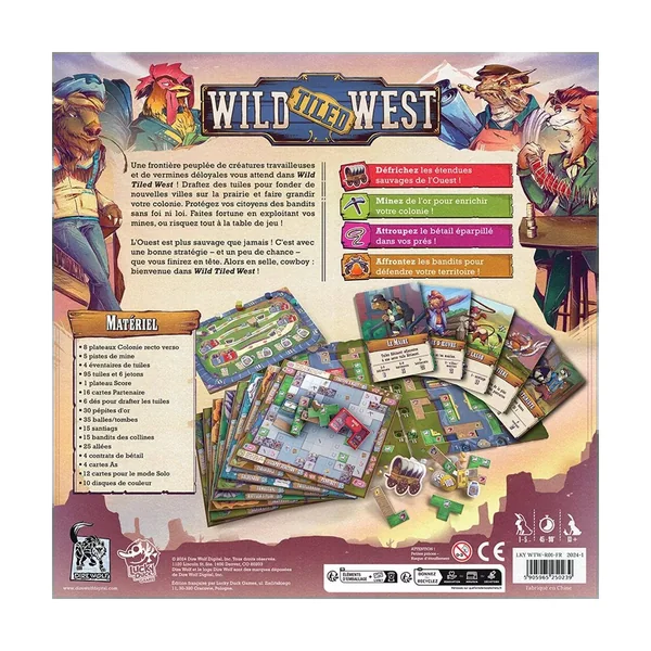 Wild Tiled West est un jeu de société de draft et de placement de tuiles pour 1 à 5 joueurs dès 13 ans, pour des parties de 45 à 90 minutes, édité par Lucky Duck Games.