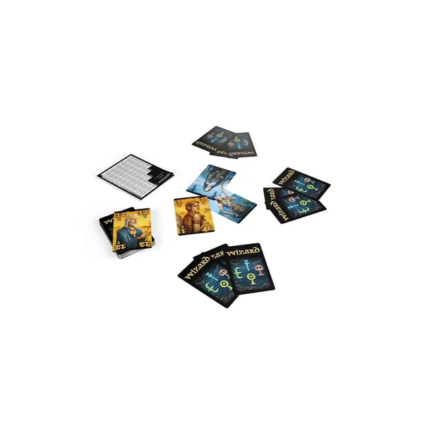 Wizard utilise un jeu de soixante cartes qui se compose du jeu traditionnel de 52 cartes. Les cartes sont réparties en 4 familles Humains, Elfes, Nains et Géants, d’une valeur de 1 à 13, plus 4 Zarbis qui prévalent sur tout et 4 Nazes qui ne valent rien. Ceux qui ont deviné juste gagnent 10 points + 10 points par plis, ceux qui se sont trompés perdent 10 points par plis en en plus ou en moins qu’annoncé. Les joueurs s’affrontent sur plusieurs tours en fonction du nombre de joueurs, et celui qui termine avec le score le plus élevé gagne.