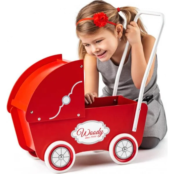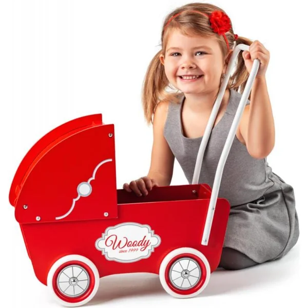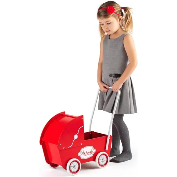 La poussette en bois au design rétro pour les plus petites filles a une haute poignée, des roues en caoutchouc et une profonde nacelle, dans laquelle une poupée allongée jusqu’à 40 cm ou tout autre objet dont un petit enfant a besoin peut être transporté en toute sécurité