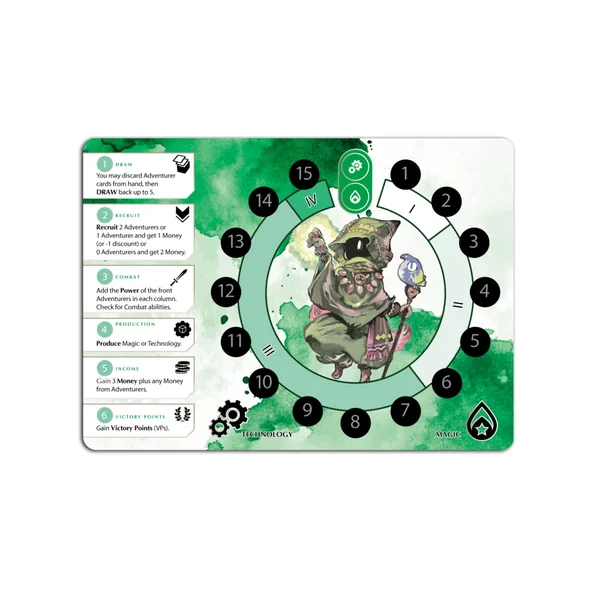 Dans Yro, vous devez recruter des aventuriers dans votre guilde et les placer dans une grille de 3×3 que vous construisez au cours du jeu. Ils ont tous une valeur de combat, qui leur rapportera des points à chaque tour si elle est supérieure à celle de l’adversaire ; ils peuvent vous accorder des points de ressources Magie et Technologie, qui vous permettront de débloquer des capacités plus puissantes, de l’Or qui vous sera utile pour recruter plus d’aventuriers et des points de Victoire qui vous mèneront à la victoire finale.