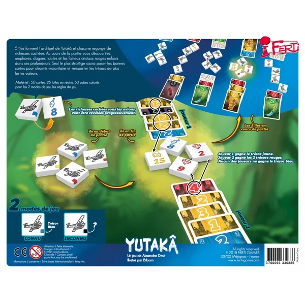 5 îles forment l’archipel de Yutakâ et chacune regorge de richesses cachées. Au cours de la partie, vous découvrirez amphores, dagues, idoles et les fameux cristaux rouges enfouis dans ses profondeurs. Seul le plus stratège saura poser les bonnes cartes pour devenir majoritaire et remporter les trésors de plus fortes valeurs.