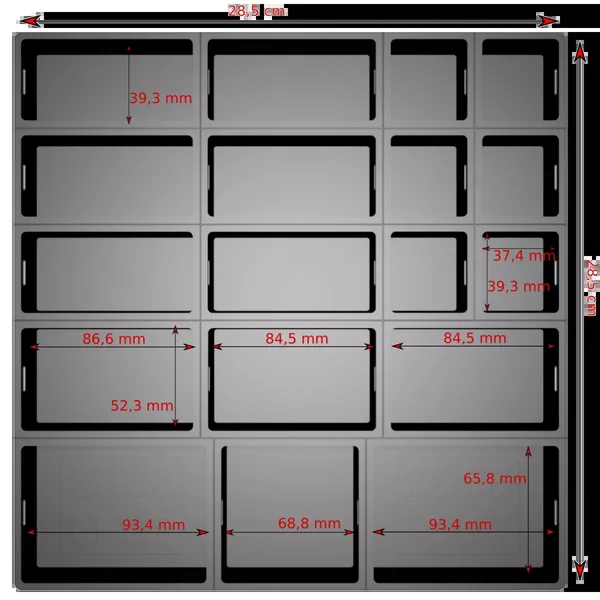 Il contient 18 compartiments avec couvercles transparents, de tailles différentes, séparés par une ligne gravée. Les compartiments peuvent être facilement découpés et utilisés individuellement ou en groupes de toutes tailles. Ses dimensions sont de 28,5 x 28,5 cm ; profondeur 2,3 cm.
