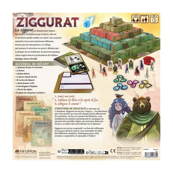 Ziggurat est un jeu coopératif en mode legacy, dont l’histoire se déploie sur six chapitres. Vos choix auront des conséquences durables sur toutes vos futures parties. À mesure que vous progressez, vous modifiez le jeu de façon permanente : nouvelles règles, matériaux, éléments ajoutés au plateau… Coopérez pour relever les défis de chaque chapitre et vivez une aventure unique, rejouable à l’infini !