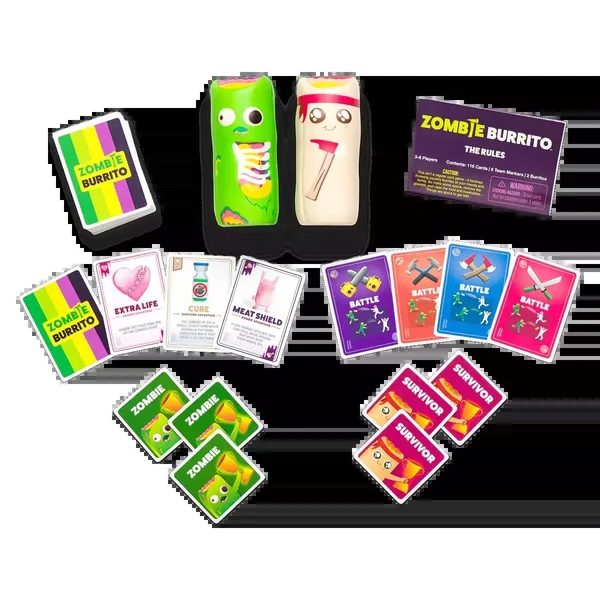 Les joueurs se divisent en deux équipes : les Survivants et les Zombies. Tous tentent de constituer des séries de trois cartes identiques, certaines offrant des pouvoirs uniques selon votre camp. Mais attention : certaines cartes déclenchent des batailles, où vous devrez éliminer vos adversaires… à coups de burritos en mousse !